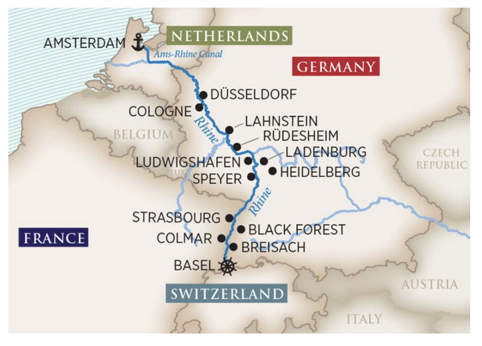 We'll embark in Basel, Switzerland, then onto Breisach, Germany; Strasbourg, France; Heidelberg & Rüdesheim, Germany; Düsseldorf, Germany; and disembark in Amsterdam, The Netherlands.